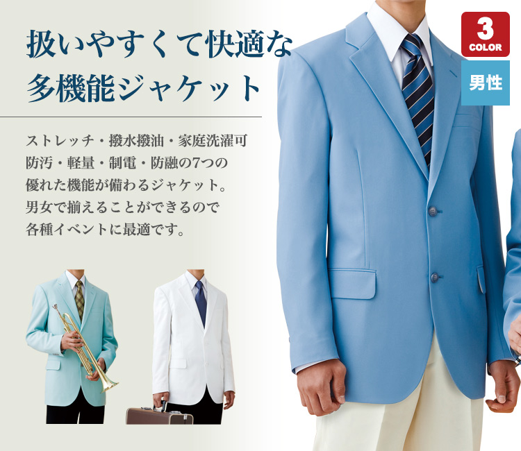 撥水、撥油、制電で快適さ抜群の爽やかなカラージャケット。サックス・ミントグリーン・ホワイトの3色、メンズ・レディースで揃えられます!!