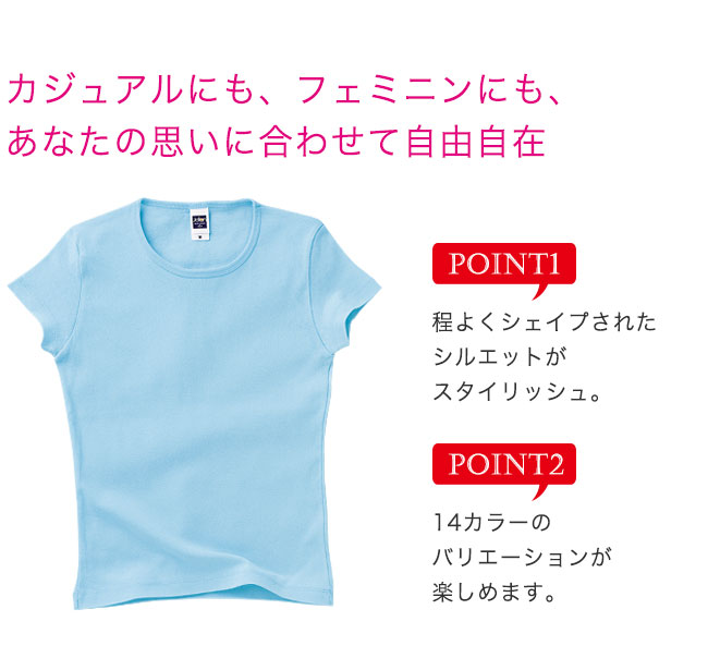 伸縮性に優れた、ソフトな着心地のレディースTシャツ。14色&4サイズで充実のバリエーション。