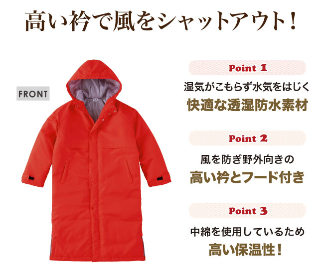 防寒機能強化&サイズ展開豊富になってリニューアルしたベンチコート。高い衿で風をシャットアウトし、裏地には高密度タフタを使用しています。湿気がこもらず、外側からは水気をはじく透質防水素材です。レディースサイズにも対応。