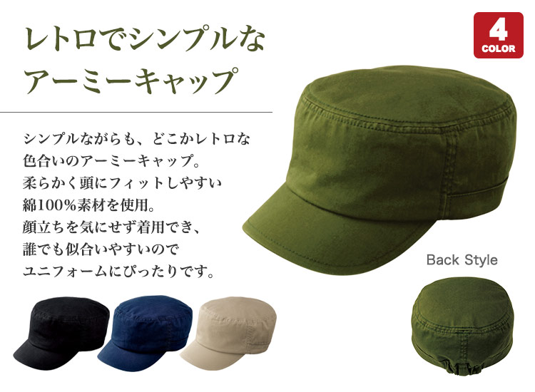 レトロでシンプルなデザインのアーミーワークキャップ。 普通とちがうスタイルのキャップをお探しの方におすすめです♪