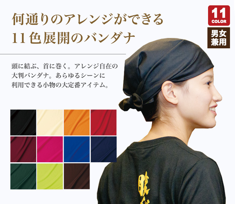 頭に結んだり、首に巻いたりとさまざまなシーンで使える大判バンダナ