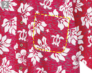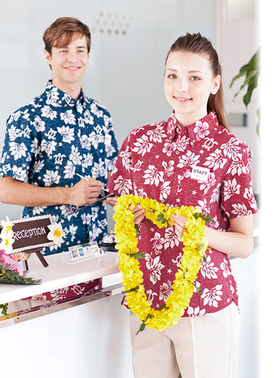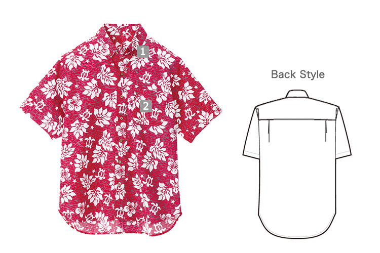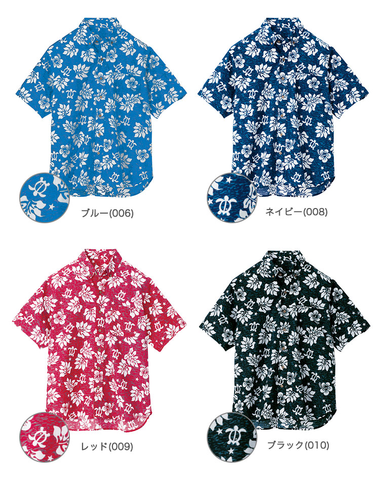 海の守り神とされているウミガメやハイビスカスの花をポップに配色した、ハワイの夜をイメージさせるアロハシャツ。ヤシボタンで南国の雰囲気を演出します。襟元はボタンダウン仕様できちんと感があります。