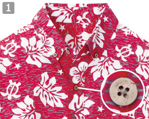 襟ハネがなく、きちんと感を演出するボタン留めタイプの襟元。ヤシボタンで南国感があります。