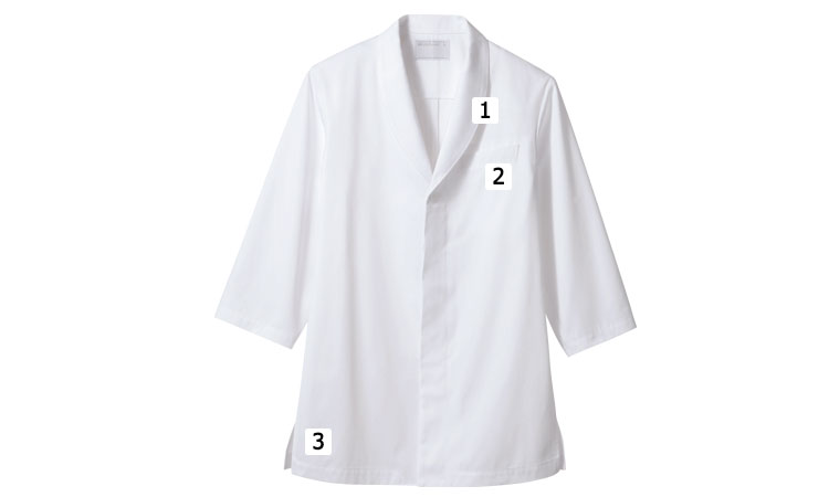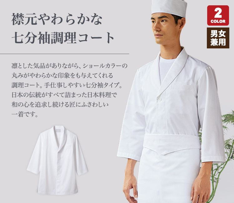 凛とした気品がありながら、ショールカラーの丸みがやわらかな印象をも与えてくれる調理コート。 手仕事しやすい七分袖タイプ。日本の伝統がすべて詰まった日本料理で和の心を追求し続ける匠にふさわしい一着です。 和食店・お寿司屋さん・蕎麦屋さん・うどん屋さん・旅館などのユニフォームにおすすめ!