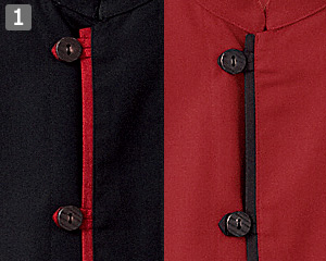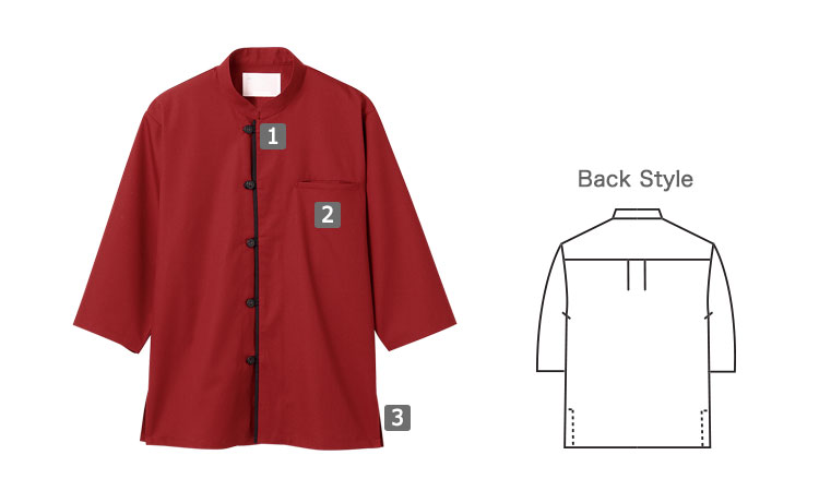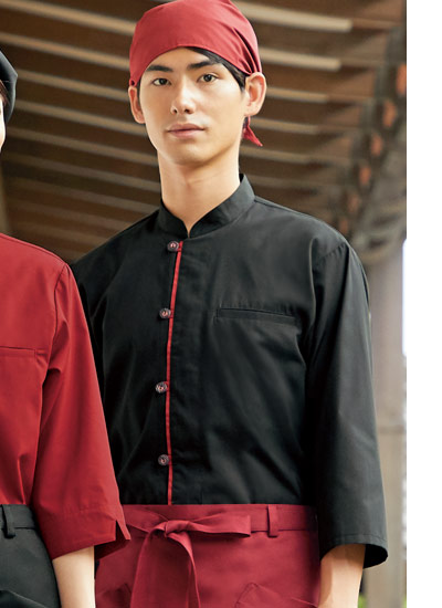 フロント中心の別配色のラインがおしゃれな七分袖和風シャツ。赤と黒の配色でアジアンテイストを演出します。