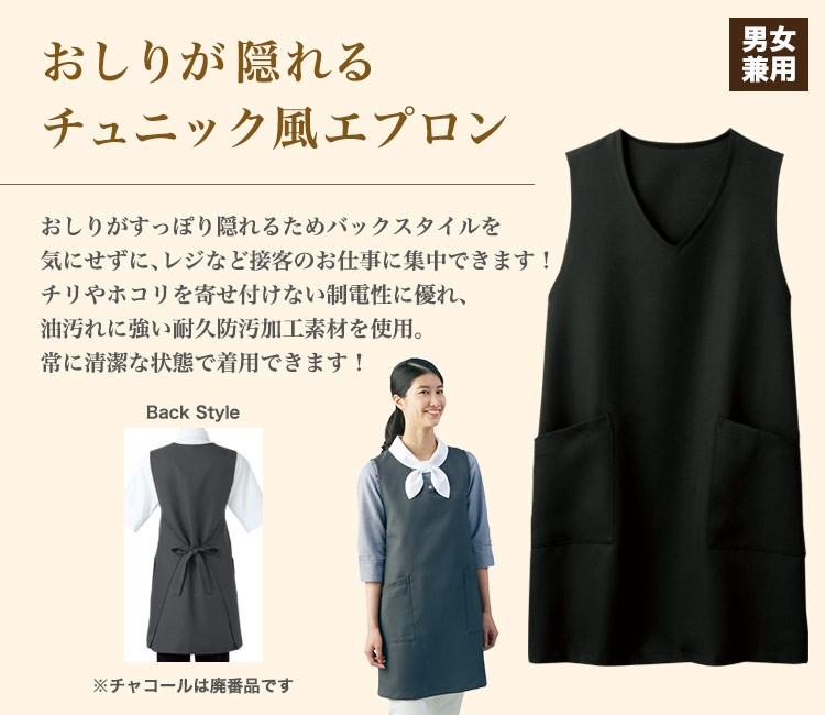 おしりがすっぽり隠れるチュニック風エプロンはバックスタイルを気にせずに、レジなどの接客のお仕事に集中できる優れもの! チリやホコリを寄せ付けない静電気防止制電素材を使用。また汚れ除去性・油性分をはじく高い撥油性・洗濯耐久性にも優れており、 衛生的で清潔な状態を保ちながら毎日楽しく働くことができます。