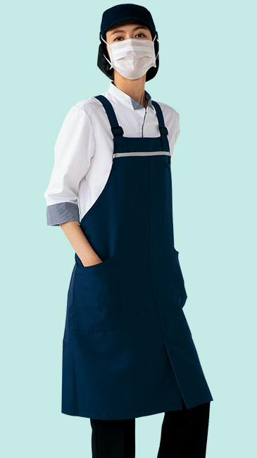 塩素消毒や工業洗濯に強いタフな素材を使用した高機能の胸当てエプロンは、しっかり洗っても色褪せずに美しい発色をキープ!