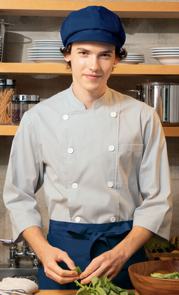 カフェやスイーツショップにおすすめのおしゃれなコックコート(コックジャケット)。細いストライプ柄がおしゃれで好印象を与えます。