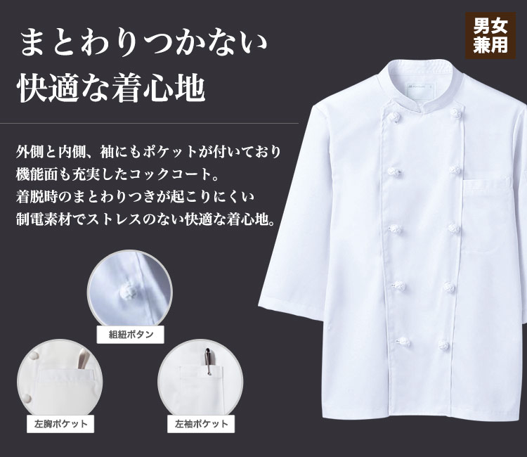 S~5Lサイズ。肌触り抜群で制電&抗菌機能が嬉しい七分袖コックコート