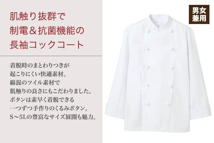 S~5Lサイズ。肌触り抜群で制電&抗菌機能が嬉しい長袖コックコート