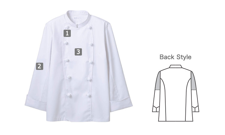 抗菌加工がついて清潔、安全!正統派スタイルに安全性をプラスした長袖コックコート。