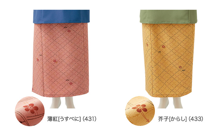 松葉紋と梅の小花が表情を明るく見せる和風ラップスカート。腰紐式で着物のような締めつけ感がなく、簡単に着用できます。