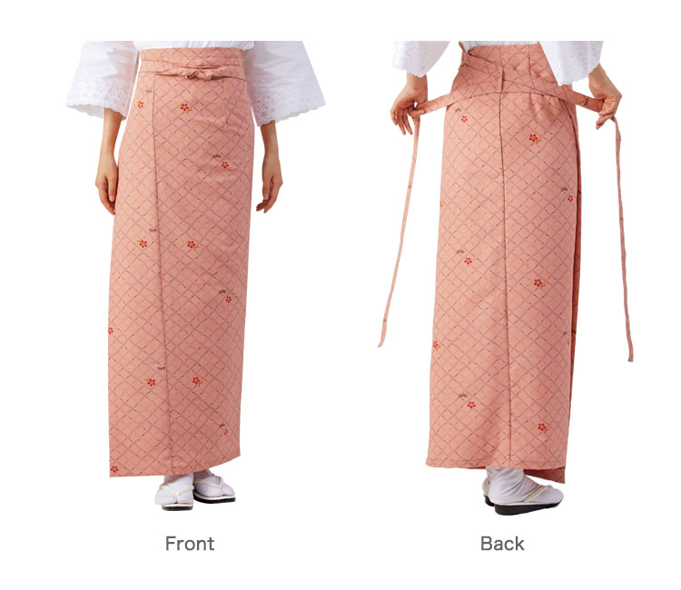 松葉紋と梅の小花が表情を明るく見せる和風ラップスカート。腰紐式で着物のような締めつけ感がなく、簡単に着用できます。