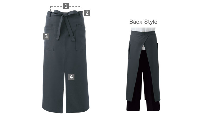 制電素材でホコリを寄せ付けず、耐久防汚加工で汚れに強い!深みのあるシックな色合いでスタイリッシュに着こなせるロングエプロン。スリット入りで足さばきも軽やかです。