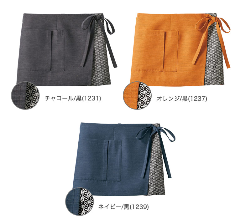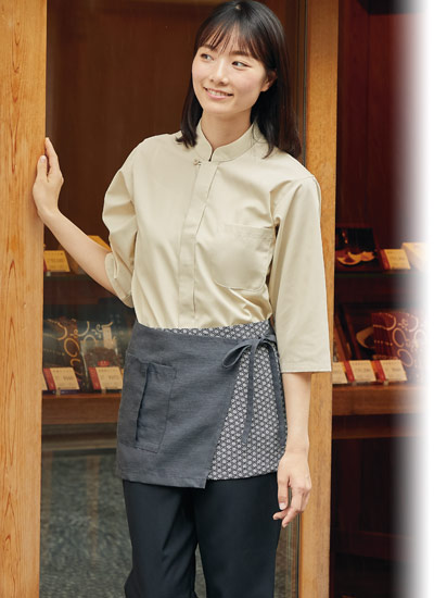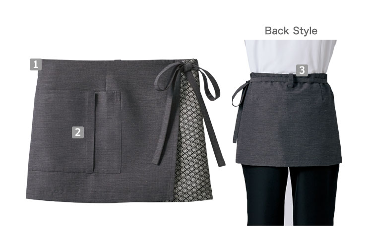 さりげなく控えめに和柄を配色したモダンな印象の和風エプロン。巻きつけるタイプで、お尻が隠れて安心です。同シリーズの和風シャツや小物と合わせると統一感アップ!