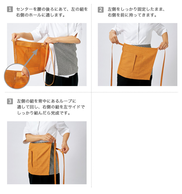 体に巻き付けるタイプのエプロンだから、気になるお尻もすっぽり隠れて安心!女性には嬉しい仕様です。