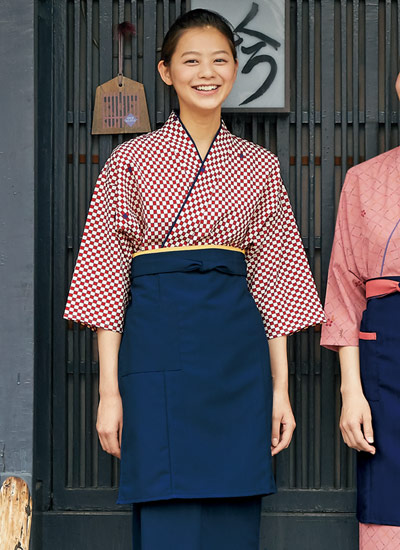 柄物を引き立てる、深みのあるちりめん素材の和風エプロン。ポリエステル100%でお手入れも簡単!