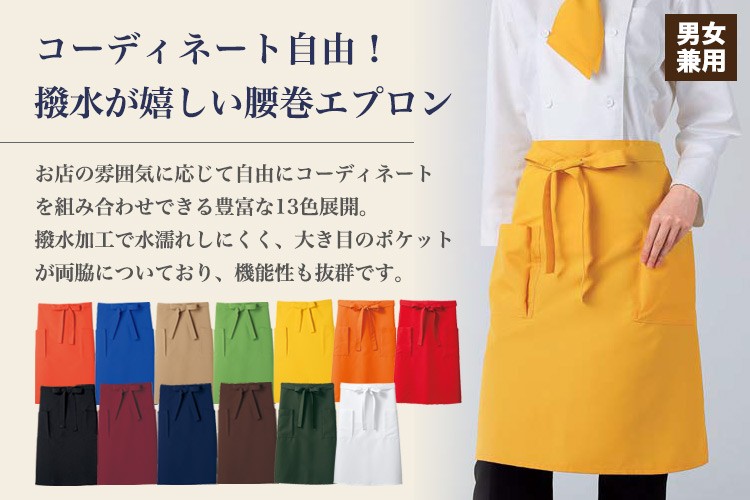 選べる13色のサロンエプロン。スマートなシルエットに使いやすい2つのポケット付きです。撥水加工も嬉しい。