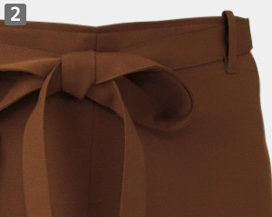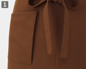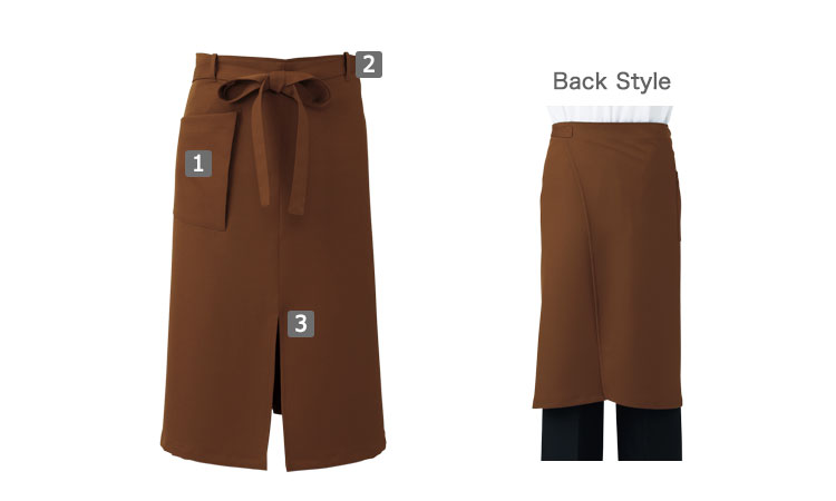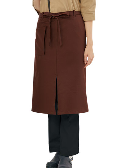 ボトムをしっかりカバーする長めの丈ながら、スリット入りで足さばきの良さも抜群のロングエプロン。