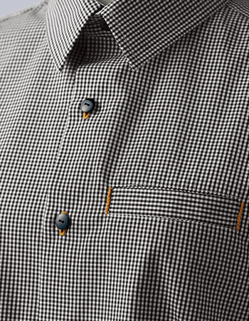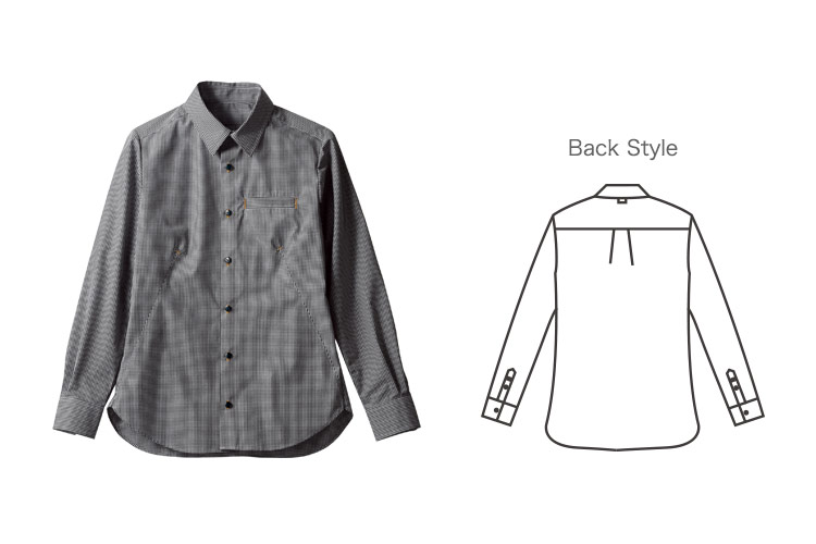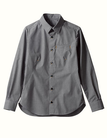 カジュアルなミニチェック柄の長袖シャツ。ポケット口のカン止めやボタンホールなど、ステッチの配色がポイントになっています。胸下にダーツを入れることですっきりとしたシルエットになり、スマートに着こなすことができます。シワになりにくい形態安定加工済み。