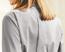 前たては胸下にダーツを入れることですっきりとしたシルエットになり、ダボつかず動きやすい仕様です。後ろにはボックスプリーツを入れ、生地のつっぱり感を軽減。ボトムスにインしてもシャツが出ないよう長めの丈感になっています。