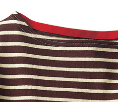 横に開いたかたちのボートネック。ちらりとのぞく赤色がおしゃれ。