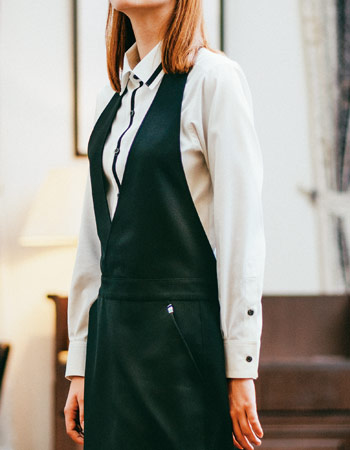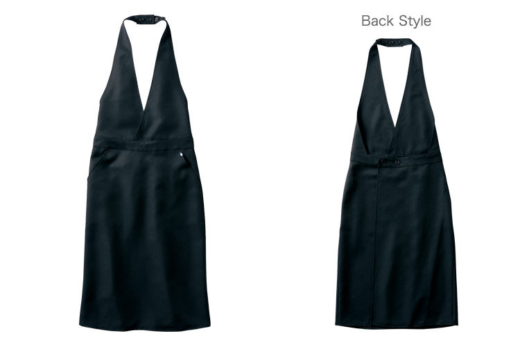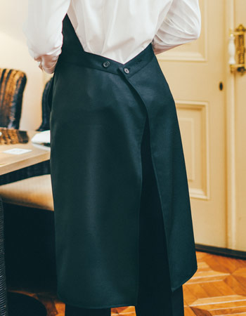ベストとエプロンを合わせたようなデザインのソムリエ風ドレスエプロン。首紐、ウエストまわりはボタンで調節が可能です。後ろはスリットのように開き、長め丈でも足さばきがよく動きやすい仕様です。