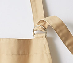 左ポケットのラインが目を引く胸当てエプロン。両脇のポケットはマチ付きで収納力抜群。バックルで紐の長さを調節できる首掛けタイプです。生地は耐久性に優れたツイル素材を使用し、綿のもつやわらかな質感が得られます。