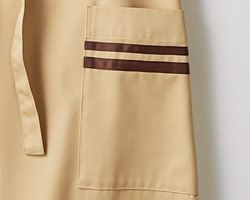 スタイルよく、おしゃれなエプロンですね。生地もしっかり厚手なのできちんとした感じで着用、上品な感じでとても良いです。生地が厚い分、厨房では着用すると結構暑い、、、、。生地色ネイビーを選んだので、クリーム、粉などの厨房作業での少しの汚れも気になります。洗濯は分けて洗わないといとボコりが付きます。洗い替えの購入は必須です。