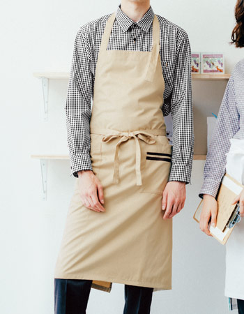 首掛けタイプの胸当てエプロン。左右のポケットはマチが付いており、抜群の収納力。左ポケットのラインがポイントになっています。ハリのあるツイル素材なので、しっかりと耐久性があります。