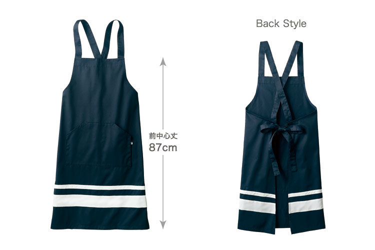 濃色のベースに、白いラインが目を引くカジュアルな胸当てエプロンです。生地はツイルを使用しており、ハリがあって耐久性も抜群。着こなしやすいデザインなので、さまざまなシーンで活躍します。