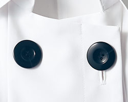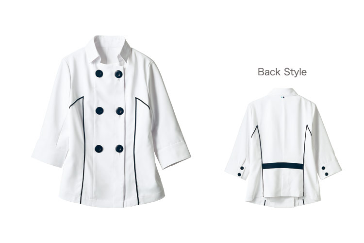 コックコートを女性向けにアレンジしたスタイリッシュなジャケット。小さめの台襟で首元をすっきりと見せ、大きめの黒ボタンがアクセントになっています。立体的なブレードを配し、七分袖で美しく見えるバランスに仕上がっています。