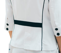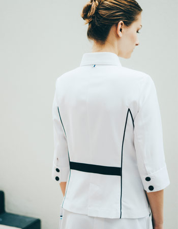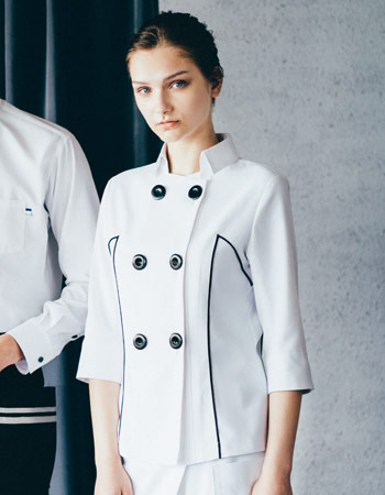コックコートを女性向けにアレンジしたスタイリッシュなジャケット。小さめの台襟が首元をすっきりと見せ、大きめのボタンがアクセントになっています。前後に立体的なブレードを配し、美しく見えるバランスに仕上げました。