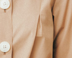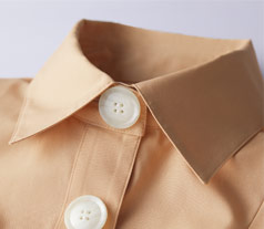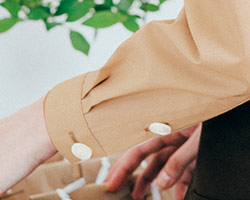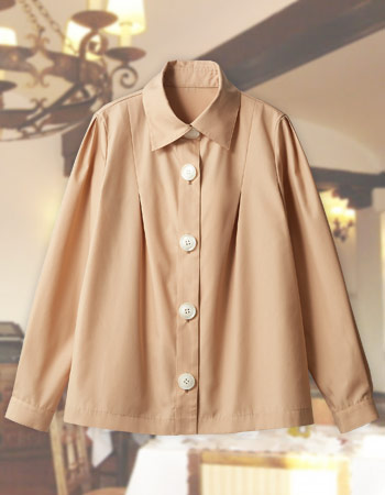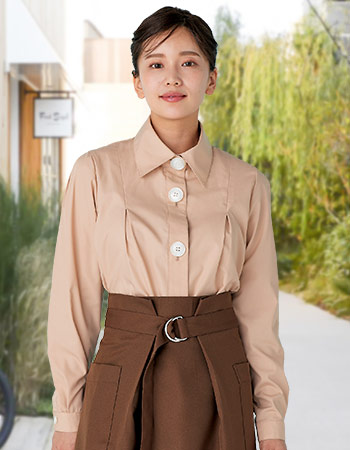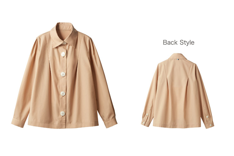 前にも後ろにもタックを入れて、ふんわりとしたシルエットに仕上がっています。やわらかでやさしげな印象を与え、親しみやすさを演出します。袖山にもタックを入れることで袖の広がりを抑え、作業のしやすさも考えられています。