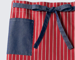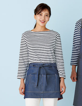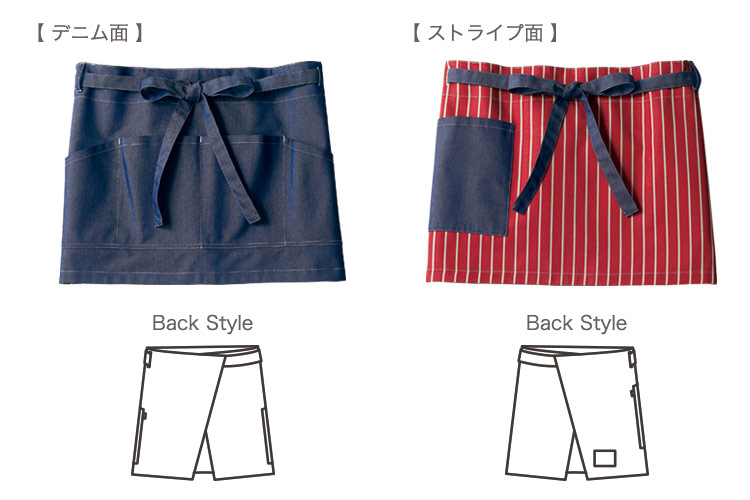 デニム面とストライプ面の2つのデザインが楽しめる、リバーシブルショートエプロン。白ステッチが可愛いデニム面はポケットが4つ付いており、収納力に優れています。ストライプ面はコーディネートのアクセントになり、ポケットと腰紐の配色がおしゃれです。
