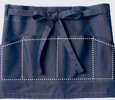 リバーシブルで使えるショートエプロン。片方は白ステッチが可愛いデニム調のデザインです。前ポケットが4つ付いており、ものを小分けに収納できて便利です。