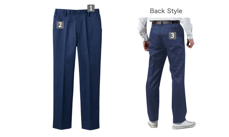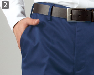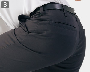 後ろ姿にも自信を持てる、シャツが出にくいパターン設計。身だしなみが大切なサービスシーンに最適です。