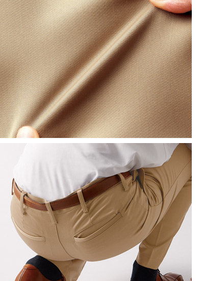 綿タッチの柔らかな風合いの交織チノクロス素材。ストレッチ性に優れていながら、特有のギラつき感がありません。また、ポリエステルの割合が高いため、お手入れ簡単です。