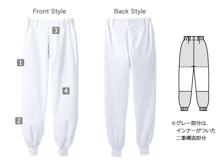 高温作業場向け!異物混入防止仕様の男女兼用ノータック両脇ゴムパンツは、下半身の動きを邪魔しない設定と、太もも、膝まわりなど、必要な箇所にゆとりをもたせて、つっぱり感を軽減。それでいてシルエットはすっきり。機能性とラインの美しさを兼ね備えています。幅広い体型に対応する6サイズ展開で、白衣の在庫管理もラクになります。食品工場のユニフォームに最適!