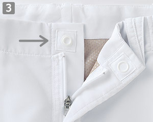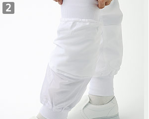 - ノータック、両脇ゴム、パンツ裾ネット(フライス仕様)、スナップ留め、ノーポケット