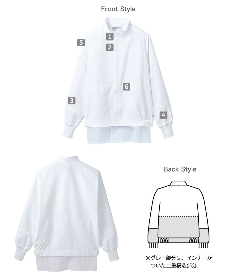 高温作業場向け!異物混入防止仕様の男女兼用長袖ジャンパーは、さまざまな肩と腕の動きをカバーする可動域の広いアームホールで、ストレスのない着心地です。また、細目シルエットの下腕袖で、盛付け作業等での汚れを防止!幅広い体型に対応する6サイズ展開で、白衣の在庫管理もラクになります。食品工場のユニフォームに最適!