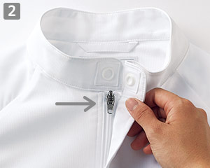 襟をしっかりスナップで固定することで衛生帽子を押さえ、ズレ上がりにくくします。