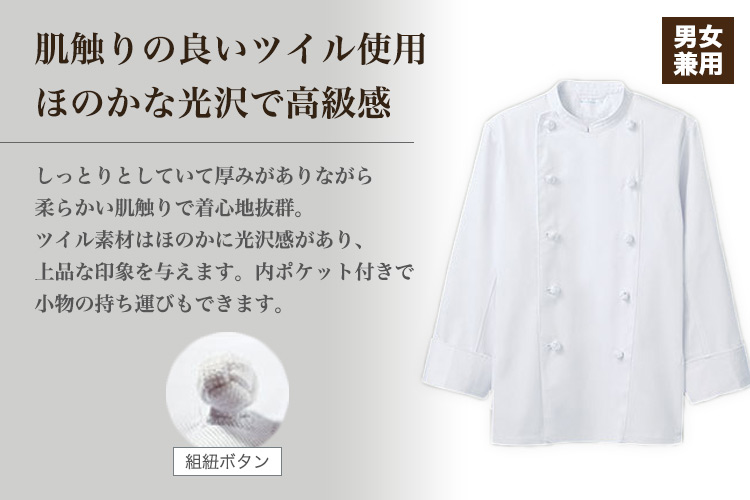 ほのかな光沢感と、上質素材が品格を感じさせるコックコート!シェフ定番の長袖タイプです。
