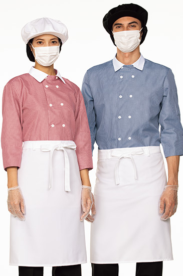 カジュアルで親しみやすいチェック柄のコックシャツ。白襟が爽やかでお客様に好印象を与えます。袖の内側にネットが付いており、チリや体毛をしっかりキャッチしてくれ、異物混入を防ぎます。割れにくい耐熱ボタンを使用し、デザイン面でも機能面でも優れたアイテムです。