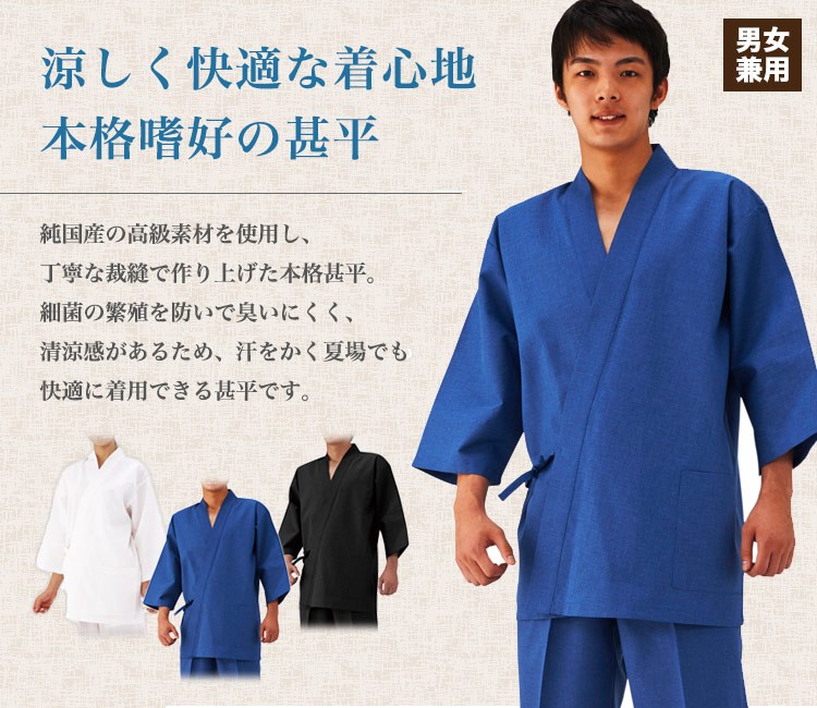 素材・形・縫製すべてにおいて本格甚平。 抗菌防臭加工生地「ピーチフレッシュ」は素材の持ち味、機能はそのままに、臭いや繊維上の菌の増殖を抑えます。防臭効果を発揮して、製品をより清潔に保ちます。お使いいただく方にご満足いただけるよう、日本の職人が素材の持ち味を活かし、品質にこだわり、丁寧に一点一点作り上げました。