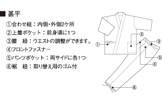 - 合わせ紐(内側・外側2ヶ所)、上着ポケット(前身頃に1つ)