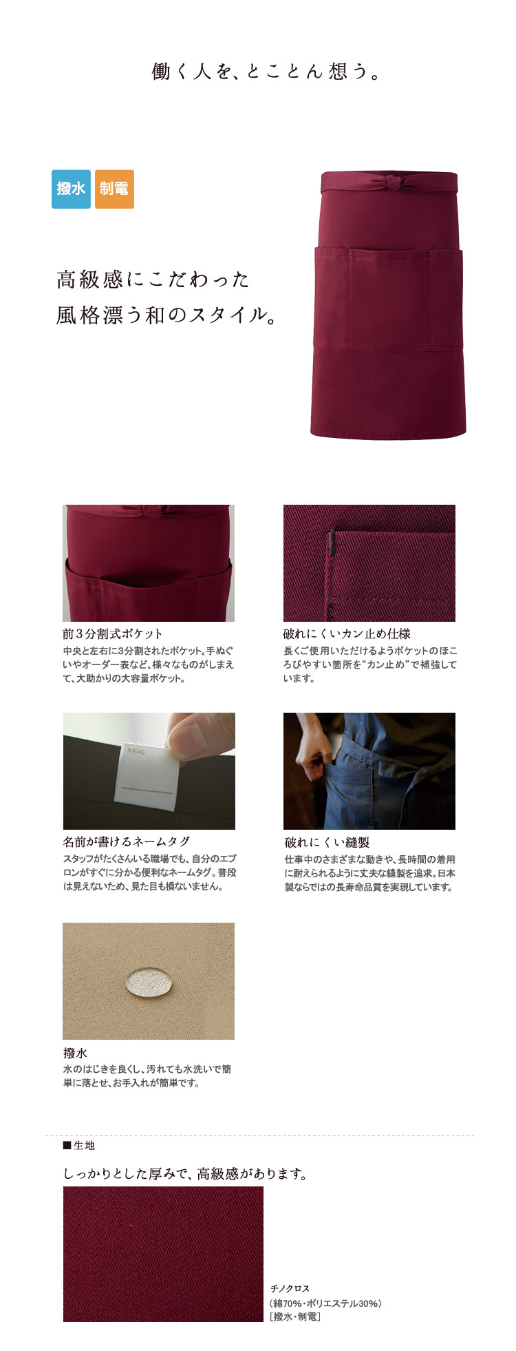 【こだわりの日本製】日本の職人が丁寧に作り上げた高級な和風ミドルエプロン。素材も縫製も日本製にこだわり、日本の職人ならではの伝統的なものづくりを生かした美しさと丈夫さ、機能性をそなえた一枚。