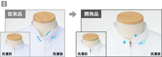 襟と身頃部分を一体にすることで、従来品と比べ洗濯した後も襟部分が折れにくい安定した仕上がり。襟先が開いたりや洗濯後に襟が折れてしまうトラブルもなく異物混入防止に効果的です。※画像は別商品です。