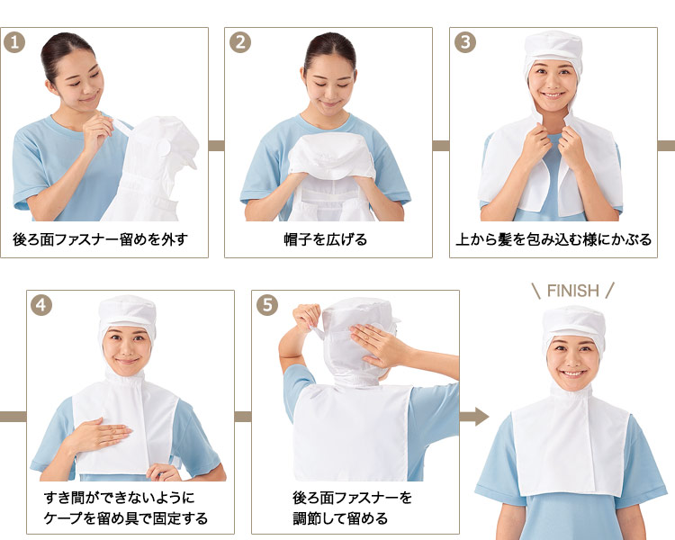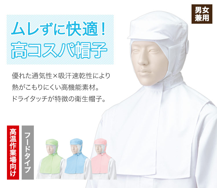 高温作業場に適した食品衛生帽子。頭から首までしっかりガードしてくれるフードタイプです。優れた通気性と吸汗速乾性で快適なつけ心地が続きます。