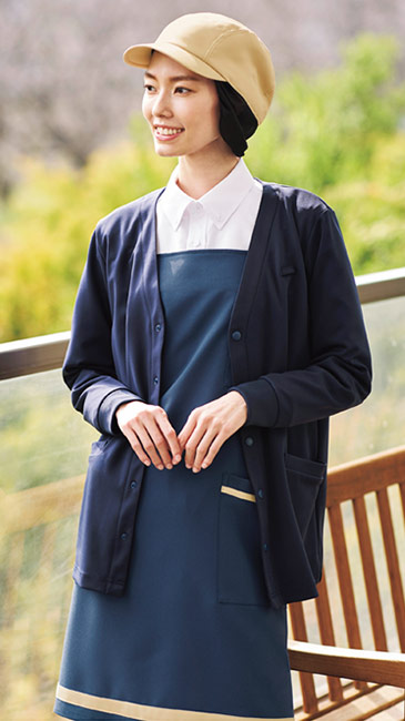 ベーシックなデザインで誰が着ても様になります。エプロンの上から羽織っても、エプロンの下に着用してももたつきません。スーパーマーケットのレジや品出しなど必要なときに着脱しやすいカーディガンです。